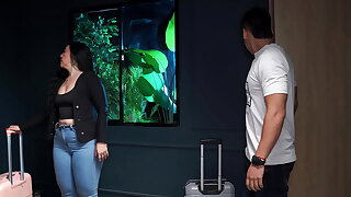 Big-bottomed stepmother shares bed after a mistake upon arrival from a trip